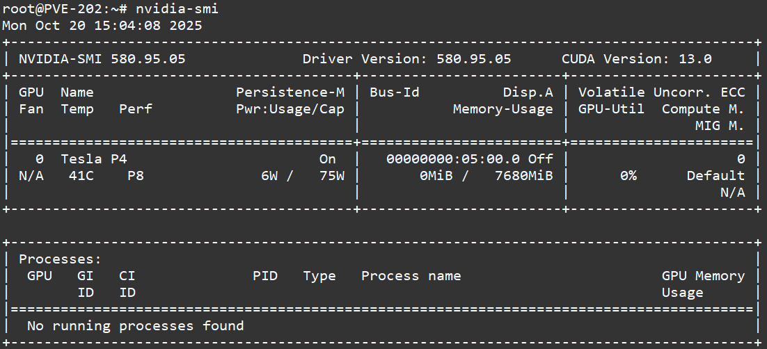 - 查詢出來的結果跟您剛剛在本機上的查詢結果要一樣,就表示您的 LXC 服務已可以直通顯卡並且有 GPU 功能